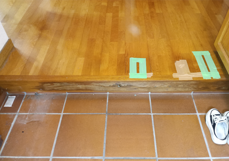 シロアリ被害を受けた玄関床は、解体せずに厚さわずか1.8mmの専用材を上張り施工。大工工事を最小限に抑えて費用をカットしつつ、他の部屋との段差も生じない、つまずきにくい安全な仕上がりです。